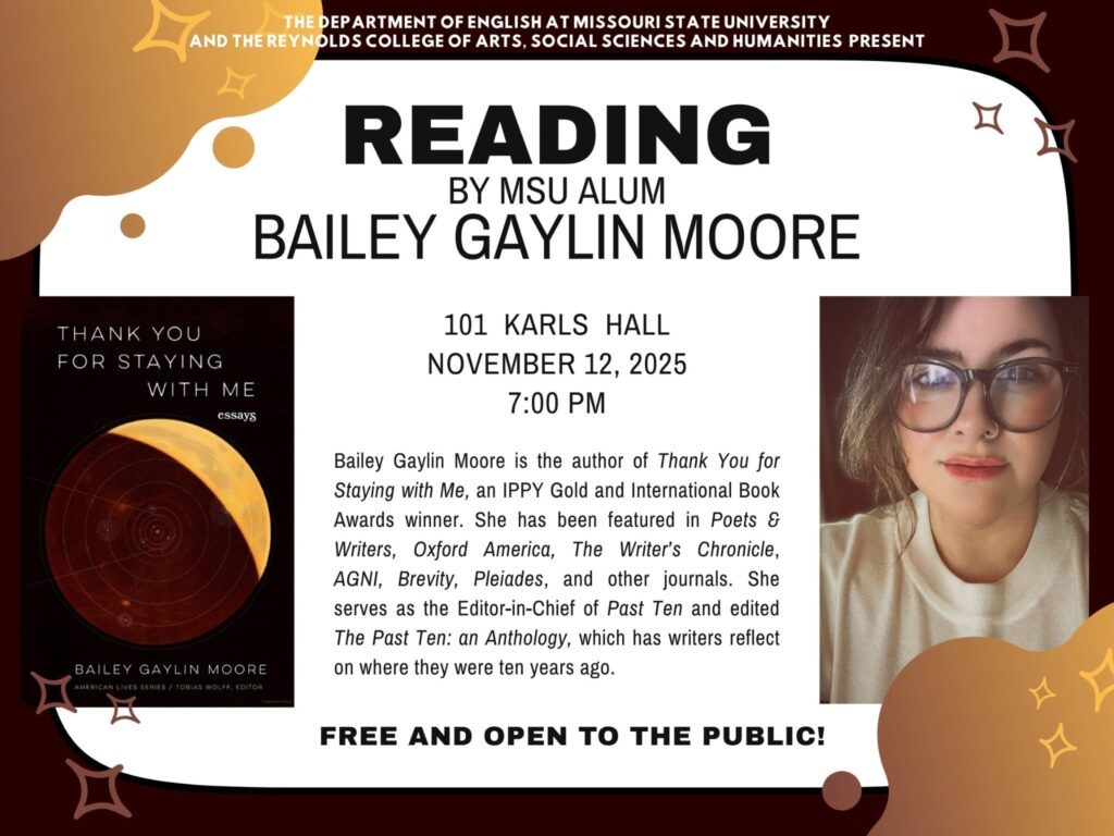 The reading is sponsored by the Missouri State University English Department and the Missouri State Reynolds College of Arts, Social Sciences, & Humanities.