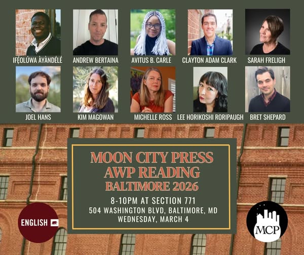 Moon City Press AWP offsite reading! Fire lineup that features MCP authors Ifeoluwa Ayandele, Andrew Bertaina, Avitus B. Carle, Clayton Adam Clark, Sarah Freligh, Joel Hans, Kim Magowan, Michelle Ross, Lee Horikoshi Roripaugh, and Bret Shepard!