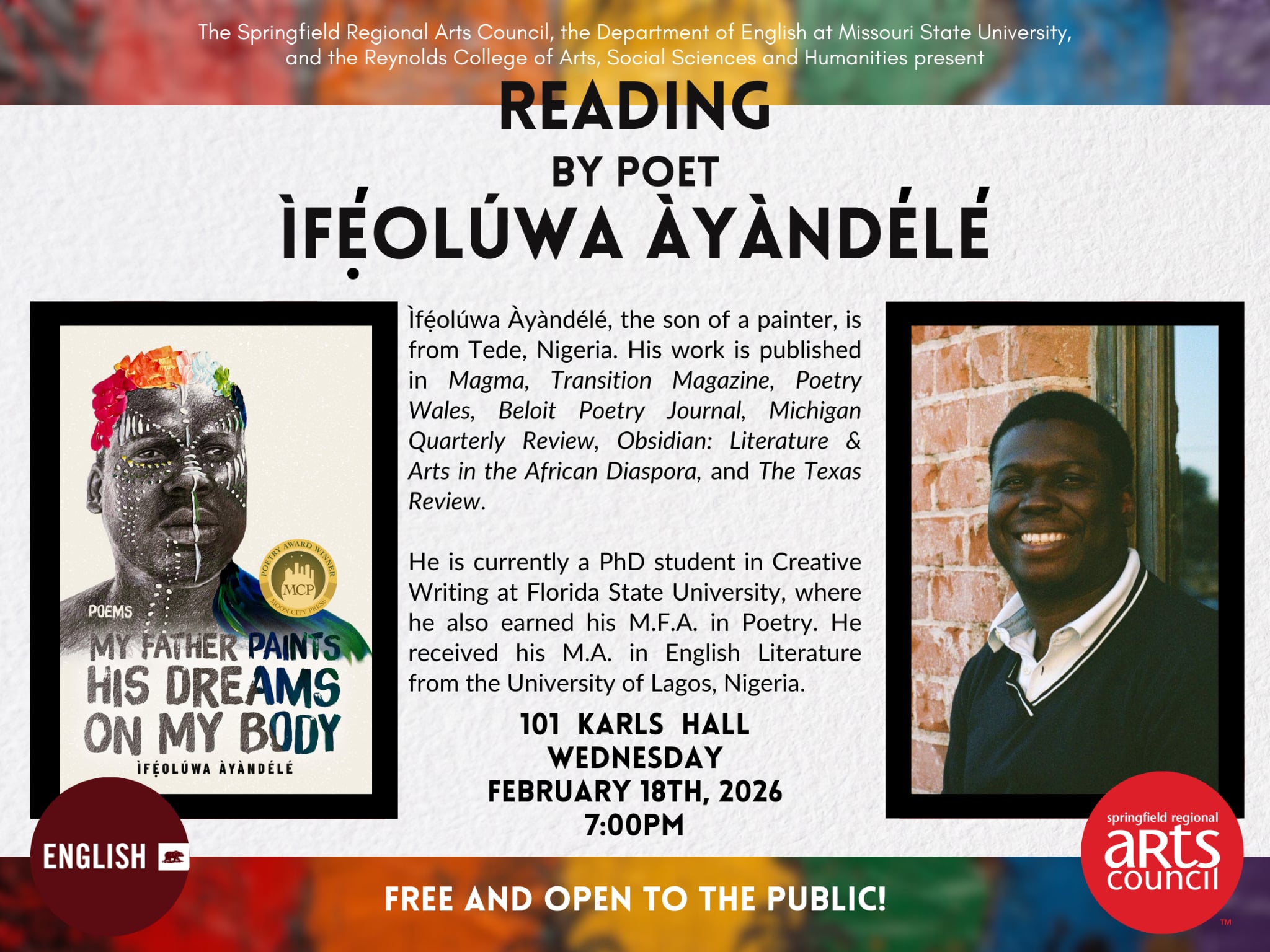 Ifeoluwa Ayandele reads tonight from his new Moon City Press book at Missouri State University! 7 p.m., CT, on campus in Karls 101. Sponsored by the Springfield Regional Arts Council, the Missouri State University English Department, and the Judith Enyeart Reynolds College of Arts, Social Sciences, and Humanities. Free and open to the public.